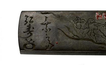| Keywords: Uchikoshi Hirotoshi - Kozuka with a View of Enoshima - Walters 51884 - Mark A.jpg The island of Enoshima lies just off the coast of Kamakura south of Tokyo This small island has been the site of shrines since the 6th century It is now a popular tourist destination At the lower right of the composition waves are shown breaking against the spit of land that connects Enoshima to the mainland A torii gate stands on the shore and the roofs of temple and shrine buildings can be seen above the tree tops At the left is a small village On the reverse is a scene of seven fishermen pulling a net full of fish and other sea creatures circa 1800 1825 late Edo shibuichi gold cm 9 6 accession number 51 884 28852 William T / Henry Walters Collection Baltimore date and mode of acquisition unknown Walters Art Museum Henry Walters Acquired by William T or Henry Walters Signature Ichijosai Hirotoshi place of origin Mtio Japan Walters Art Museum license Tosogu Japanese sword fittings in the Walters Art Museum Uchikoshi Hirotoshi Media contributed by the Walters Art Museum needs category review |