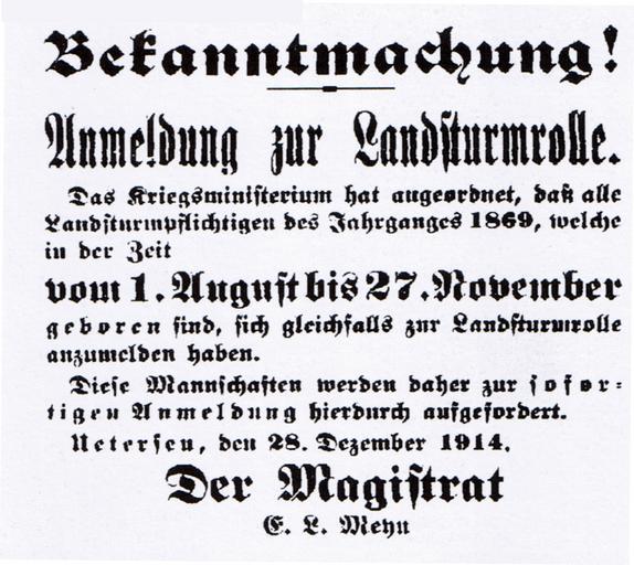 | Keywords: Uetersen Anmeldung zun Landsturm 1914.jpg de Zeitungsanzeige in den Uetersener Nachrichten vom 28 Dezember 1914 eigene reproduktion das Original mehr als 70 Jahre alt own reproduktion original is more than 70 years old Author 1914 Germany in World War I Documents of Uetersen World War I PD-old |