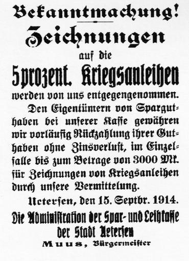 | Keywords: Uetersen Bekanntmachung Kriegsanleihe 1914.jpg de Bekanntmachung zur Zeichnung auf die 5prozentige Kriegsanleihe in den Uetersener Nachrichten 1914 eigene reproduktion das Original mehr als 70 Jahre alt own reproduktion original is more than 70 years old Author 1914 Germany in World War I Documents of Uetersen World War I PD-old |