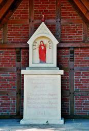 Keywords: Uffeln Betstock Nordbahnstrasse 3.jpg en Wayside shrine Our Lady of the Seven Sorrows Nordbahnstraße in Ibbenbüren-Uffeln Kreis Steinfurt North Rhine-Westphalia Germany It is a listed cultural heritage monument de Betstock an der Nordbahnstraße in Ibbenbüren-Uffeln Kreis Steinfurt Nordrhein-Westfalen Deutschland Der in einem kleinen Fachwerk-Bethäuschen untergebrachte Bildstock befindet sich direkt hinter dem Gleis der Tecklenburger Nordbahn vor dem Gelände des Landgasthofes Mutter Bahr und wird von der Familie Bahr gepflegt und instandgehalten Die Inschriften H Bahr 1 5 1839 und Thers Huntemann 1 5 1839 weisen auf die Stifter hin Daher wird der Betstock auf das Jahr 1839 datiert obwohl im Sockel die Jahreszahl 1861 eingehauen ist Der Sockel aus Sandstein enthält zudem die Inschriften Ein Schwert wird deine eigene/ Seele durchdringen oben und darunter O Jungfrau weinend flehen wir/ wenn einst der Tod uns ruft von hier/ bring Trost uns dann in Angst und Not/ und Hilfe wo Verderben droht Der Aufsatz des Bildstocks zeigt eine Mater-dolorosa-Darstellung Die sieben Schmerzen Mariens Das žObjekt der Volksfrömmigkeit steht seit 1985 komplett unter Denkmalschutz Ibbenbüren A 022 own J -H Janßen 2012-05-26 Betstock žDie sieben Schmerzen Mariens Uffeln Timber framing in Ibbenbüren German inscriptions in Germany Ibbenburen-Uffeln 2012 in Ibbenbüren 20120526 Ibbenburen-Uffeln May 2012 in Germany 20120526 Ibbenburen-Uffeln Bilder von J -H Janßen Cc-zero |