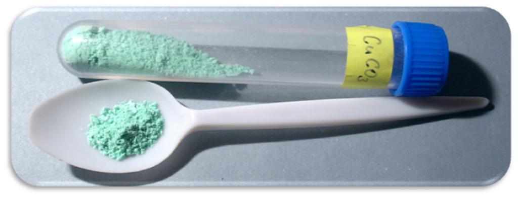 Keywords: Uhličitan měďnatý.PNG Uhličitan měďnatý - CuCO3 own 2007-06-24 Ondřej Mangl Není nutno Copper II carbonate Samples of chemical compounds
