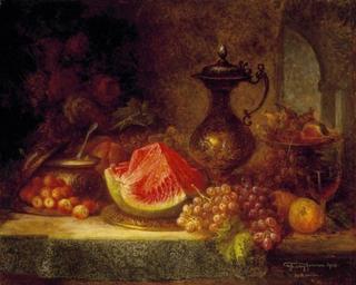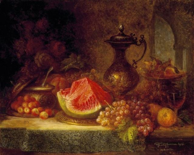 Keywords: Ujházy Still Life with a Mug and Fruit 1916.jpg Artwork Creator Ferenc Ujházy 1916 Oil on canvas Size cm 87 71 Private collection object history exhibition history credit line bottom right Ujházy Ferenc 89 évében 1916 accession number http //www kieselbach hu/ kieselbach hu http //www kieselbach hu/artwork/still-life-with-a-mug-and-fruit_9286 lang en Info http //www kieselbach hu/upload/artwork/14/783/1 jpg Pic PD-old-100 Ferenc Ujházy Still life paintings of melons 1910s still-life paintings