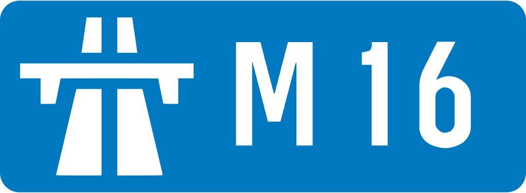 Keywords: UK-Motorway-M16.svg Motorway badge for the M16 motorway Own 2007-05-06 User Max Naylor British motorway plaques 16 number