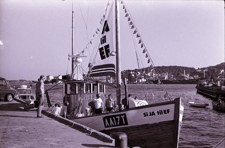 Keywords: outdoor 40 år siden EF-avstemningen 1972:Folkeavstemningen om norsk medlemskap i EF 24. og 25. september 1972 ga som resultat at et flertall svarte nei til medlemskap. Ved avstemningen stemte 46,5 prosent ja og 53,5 prosent nei. Sommeren 1972 dro Ja-aksjonen langs Sørlandskysten med båt for å spre sitt budskap. Partene i valgkampen sto steilt mot hverandre og en SF-er kalte skipperen av Ja til EF-båten for ”prostituert fisker” og ”landsforræder” fordi han lånte ut sin båt til Ja-aksjonen. Her ligger båten til kai i Arendal. Arkivref: Riksarkivet, Pa 0797 – Billedbladet NÅ, 7375_3 40 år siden EF-avstemningen 1972:Folkeavstemningen om norsk medlemskap i EF 24. og 25. september 1972 ga som resultat at et flertall svarte nei til medlemskap. Ved avstemningen stemte 46,5 prosent ja og 53,5 prosent nei. Sommeren 1972 dro Ja-aksjonen langs Sørlandskysten med båt for å spre sitt budskap. Partene i valgkampen sto steilt mot hverandre og en SF-er kalte skipperen av Ja til EF-båten for ”prostituert fisker” og ”landsforræder” fordi han lånte ut sin båt til Ja-aksjonen. Her ligger båten til kai i Arendal. Arkivref: Riksarkivet, Pa 0797 – Billedbladet NÅ, 7375_3
