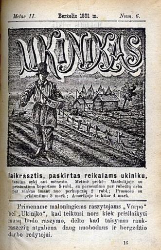 Keywords: Ūkininkas, issue 6.jpg Ūkininko Å¡eÅ¡tasis numeris 6th issue of Lithuanian newspaper Ūkininkas From collection of Å iauliai AuÅ¡ra Museum 1891-06 Editorial staff of Ūkininkas and Varpas PD-old PD-old original upload log page lt wikipedia C5 AAkininkas jpg 2006-03-12 06 04 Lazdynas 293×453× 83984 bytes <nowiki> GFDL AuÅ¡ros muziejaus rinkinys</nowiki> Newspapers of Lithuania |