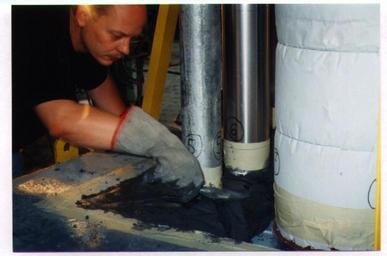 Keywords: Ulc prueflingsaufbau.jpg Construction of a test sample consisting of a mock-up concrete floor frame complete with penetrants The concrete frame measures approximately 5' x 9' x 4 ca 1 5m x 2 3m x 10cm It has a large hole in the centre with many mechanical and electrical services traversing The penetrants extend 1' 30cm into the furnace and 3' 91cm on the unexposed side A firestop mortar is being applied here Notice the intumescent http //multimedia mmm com/mws/mediawebserver dyn 6666660Zjcf6lVs6EVs666lX3COrrrrQ- wrap strip surrounding the fibreglass pipe insulation When the fire starts this embedded intumescent will swell to take up the place of the melting insulation The test was conducted in accordance with the Canadian firestop test method http //www ulc ca/ ULC S-115 in Scarborough Ontario Own 2005-06-24 Achim Hering Firestop installation equipment Firestops being installed Firestop mortar Plumbing Pipes Cement Thermal insulation Fibreglass Men at work 3M Fire Barrier Mortar Pipe covering |