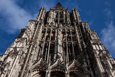 Keywords: ulm cathedral architecture building church main tower skyward aspiring gothic tracery sky blue clouds high