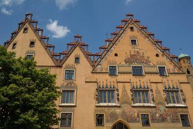 Keywords: ulm town hall facade yellow painting ulmer hall frescoes monument early renaissance secco painting mural coat of arms gable