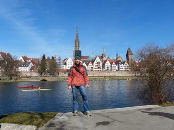 Keywords: ulm ulm cathedral danube water sports kayak city outlook city view münster view home homes sky church steeple roofs city panorama panorama spire city wall metzgerturm town home river water human man stand holiday photo memory