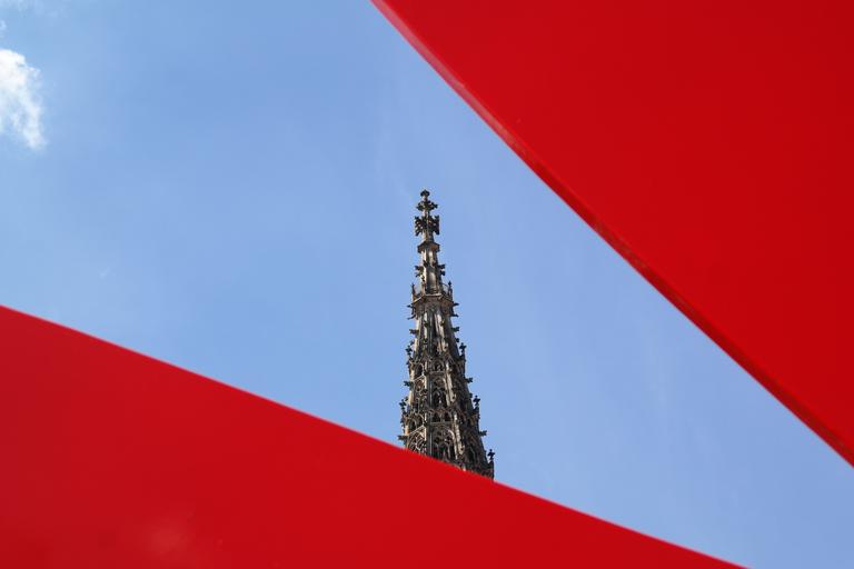 Keywords: ulmer münster tower architecture building art artwork keith haring red dog ulm ulm cathedral church steeple sky blue red