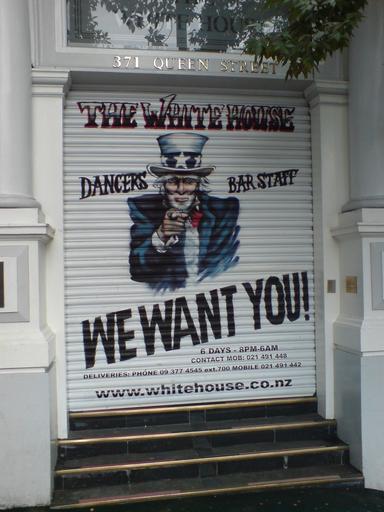 Keywords: Uncle Sam Strip Club On Queen, Auckland.jpg The entrance to the 'White House' stripclub in Auckland New Zealand self-photographed 2011-02 Uploader -36 8553491 174 7624746 Photos taken by Ingolfson 2011 in New Zealand Derivative works of I want you for the U S Army nearest recruiting station Entrances in New Zealand Strip clubs in New Zealand Queen Street Auckland Entertainment venues in Auckland Roller shutters Advertisements in New Zealand |
