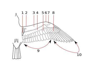| Keywords: Underwing.svg Underwing of bird showing feather nomenclature Own 2007-04 L Shyamal 1 Axillaries 2 Margin Marginal underwing coverts 3 Lesser underwing coverts 4 Median underwing coverts Secondary coverts 5 Greater underwing coverts Secondary coverts 6 Carpal joint 7 Lesser underwing primary coverts 8 Greater undering primary coverts 9 Secondaries 10 Primaries Created with Inkscape Bird wing feather diagrams SVG bird anatomy | ||||