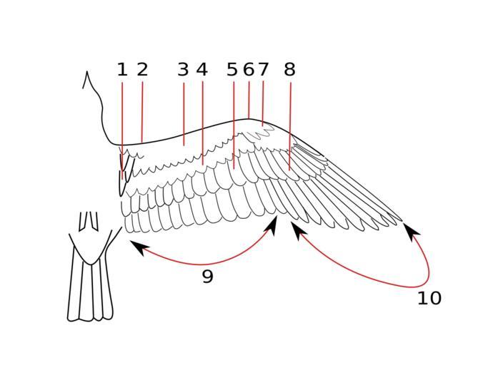 Keywords: Underwing.svg Underwing of bird showing feather nomenclature Own 2007-04 L Shyamal 1 Axillaries 2 Margin Marginal underwing coverts 3 Lesser underwing coverts 4 Median underwing coverts Secondary coverts 5 Greater underwing coverts Secondary coverts 6 Carpal joint 7 Lesser underwing primary coverts 8 Greater undering primary coverts 9 Secondaries 10 Primaries Created with Inkscape Bird wing feather diagrams SVG bird anatomy |