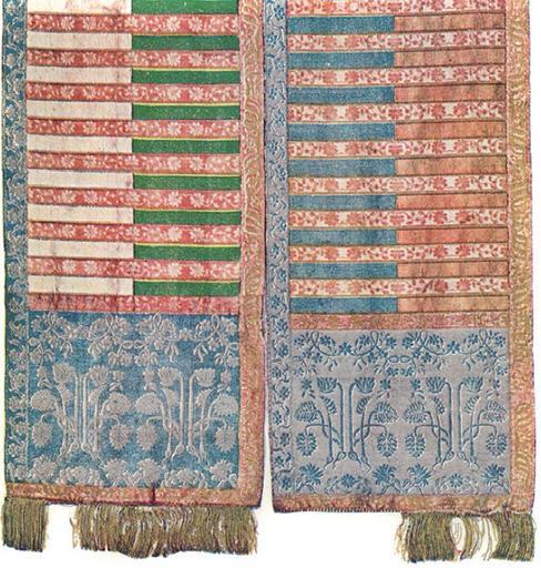 Keywords: Unger manufacture Kontusz sash.jpg Kontusz sash four sided Pas kontuszowy czterostronny Aleksander Unger manufacture in KobyĆka century 18 silk gold thread cm 48 340 Tadeusz MaĆkowski 1937 Pasy polskie Polish Sashes Arkady Signed FAB/RYK KOB/YĆKI Owned by National Museum in Warsaw lost 1939 PD-Art PD-Art Kontusz sashes Textiles lost in Poland during World War II Missing items from the National Museum in Warsaw |