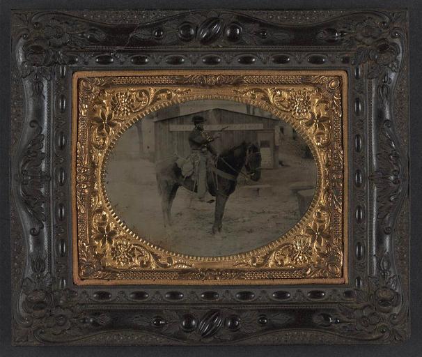 Keywords: library of congress libraryofcongress dc:identifier=http://hdl.loc.gov/loc.pnp/ppmsca.27512 dc:identifier=httphdllocgovlocpnpppmsca27512 xmlns:dc=http://purl.org/dc/elements/1.1/ xmlns:dc=httppurlorgdcelements11 u.s. civil war uscivilwar american civil war americancivilwar the civil war thecivilwar civil war civilwar war between the states warbetweenthestates united states of america unitedstatesofamerica u.s.a. usa the union theunion union the north thenorth yankee yankees soldier cavalry cavalryman saber sabre horse gun pistol revolver photo border [Unidentified cavalry soldier in Union uniform with saber, revolver, and cap box atop horse with saddlebags in front of boots, shoes, and gloves shop] [between 1861 and 1865] 1 photograph : quarter-plate tintype, hand-colored ; 13.8 x 16.3 cm (frame) Notes: Title devised by Library staff. Case: Berg, no. 7-21. Additional information in collections file. Gift; Tom Liljenquist; 2010; (DLC/PP-2010:105). Purchased from: The Horse Soldier, Cashtown, Pa., 2002. Published in: Crouch, Howard R. Horse equipment of the Civil War era. Fairfax, Va.: SCS Publications, 2003, p. 172. Subjects: United States.--Army--People--1860-1870. Soldiers--Union--1860-1870. Military uniforms--Union--1860-1870. Handguns--1860-1870. Daggers & swords--1860-1870. Horses--1860-1870. Leather goods stores--1860-1870. United States--History--Civil War, 1861-1865--Military personnel--Union. United States--History--Civil War, 1861-1865--Animals--Union. Format: Portrait photographs--1860-1870. Tintypes--Hand-colored--1860-1870. Rights Info: No known restrictions on publication. Repository: Library of Congress, Prints and Photographs Division, Washington, D.C. 20540 USA, hdl.loc.gov/loc.pnp/pp.print Part Of: Ambrotype/Tintype filing series (Library of Congress) (DLC) 2010650518 Liljenquist Family collection (Library of Congress) (DLC) 2010650519 More information about this collection is available at hdl.loc.gov/loc.pnp/pp.lilj Persistent URL: hdl.loc.gov/loc.pnp/ppmsca.27512 Call Number: AMB/TIN no. 5002 [Unidentified cavalry soldier in Union uniform with saber, revolver, and cap box atop horse with saddlebags in front of boots, shoes, and gloves shop] [between 1861 and 1865] 1 photograph : quarter-plate tintype, hand-colored ; 13.8 x 16.3 cm (frame) Notes: Title devised by Library staff. Case: Berg, no. 7-21. Additional information in collections file. Gift; Tom Liljenquist; 2010; (DLC/PP-2010:105). Purchased from: The Horse Soldier, Cashtown, Pa., 2002. Published in: Crouch, Howard R. Horse equipment of the Civil War era. Fairfax, Va.: SCS Publications, 2003, p. 172. Subjects: United States.--Army--People--1860-1870. Soldiers--Union--1860-1870. Military uniforms--Union--1860-1870. Handguns--1860-1870. Daggers & swords--1860-1870. Horses--1860-1870. Leather goods stores--1860-1870. United States--History--Civil War, 1861-1865--Military personnel--Union. United States--History--Civil War, 1861-1865--Animals--Union. Format: Portrait photographs--1860-1870. Tintypes--Hand-colored--1860-1870. Rights Info: No known restrictions on publication. Repository: Library of Congress, Prints and Photographs Division, Washington, D.C. 20540 USA, hdl.loc.gov/loc.pnp/pp.print Part Of: Ambrotype/Tintype filing series (Library of Congress) (DLC) 2010650518 Liljenquist Family collection (Library of Congress) (DLC) 2010650519 More information about this collection is available at hdl.loc.gov/loc.pnp/pp.lilj Persistent URL: hdl.loc.gov/loc.pnp/ppmsca.27512 Call Number: AMB/TIN no. 5002 |