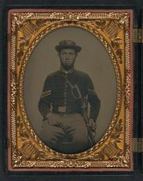 Keywords: library of congress libraryofcongress dc:identifier=http://hdl.loc.gov/loc.pnp/ppmsca.27117 dc:identifier=httphdllocgovlocpnpppmsca27117 xmlns:dc=http://purl.org/dc/elements/1.1/ xmlns:dc=httppurlorgdcelements11 people photo border picture frame [Unidentified soldier in Union corporal's uniform and 17th regiment cavalry slouch cap with U.S. Model 1860 cavalry saber] [between 1861 and 1865] 1 photograph : quarter-plate ambrotype, hand-colored ; 12.1 x 9.6 cm (case) Notes: Title devised by Library staff. Case: Berg, no. 3-37. Gift; Tom Liljenquist; 2010; (DLC/PP-2010:105). Subjects: United States.--Army--People--1860-1870. Soldiers--Union--1860-1870. Military uniforms--Union--1860-1870. Daggers & swords--1860-1870. United States--History--Civil War, 1861-1865--Military personnel--Union. Format: Portrait photographs--1860-1870. Ambrotypes--Hand-colored--1860-1870. Rights Info: No known restrictions on publication. Repository: Library of Congress, Prints and Photographs Division, Washington, D.C. 20540 USA, hdl.loc.gov/loc.pnp/pp.print Part Of: Ambrotype/Tintype filing series (Library of Congress) (DLC) 2010650518 Liljenquist Family collection (Library of Congress) (DLC) 2010650519 More information about this collection is available at hdl.loc.gov/loc.pnp/pp.lilj Persistent URL: hdl.loc.gov/loc.pnp/ppmsca.27117 Call Number: AMB/TIN no. 2264 [Unidentified soldier in Union corporal's uniform and 17th regiment cavalry slouch cap with U.S. Model 1860 cavalry saber] [between 1861 and 1865] 1 photograph : quarter-plate ambrotype, hand-colored ; 12.1 x 9.6 cm (case) Notes: Title devised by Library staff. Case: Berg, no. 3-37. Gift; Tom Liljenquist; 2010; (DLC/PP-2010:105). Subjects: United States.--Army--People--1860-1870. Soldiers--Union--1860-1870. Military uniforms--Union--1860-1870. Daggers & swords--1860-1870. United States--History--Civil War, 1861-1865--Military personnel--Union. Format: Portrait photographs--1860-1870. Ambrotypes--Hand-colored--1860-1870. Rights Info: No known restrictions on publication. Repository: Library of Congress, Prints and Photographs Division, Washington, D.C. 20540 USA, hdl.loc.gov/loc.pnp/pp.print Part Of: Ambrotype/Tintype filing series (Library of Congress) (DLC) 2010650518 Liljenquist Family collection (Library of Congress) (DLC) 2010650519 More information about this collection is available at hdl.loc.gov/loc.pnp/pp.lilj Persistent URL: hdl.loc.gov/loc.pnp/ppmsca.27117 Call Number: AMB/TIN no. 2264 |