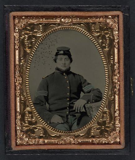 Keywords: library of congress libraryofcongress dc:identifier=http://hdl.loc.gov/loc.pnp/ppmsca.27345 dc:identifier=httphdllocgovlocpnpppmsca27345 xmlns:dc=http://purl.org/dc/elements/1.1/ xmlns:dc=httppurlorgdcelements11 u.s. civil war uscivilwar american civil war americancivilwar the civil war thecivilwar civil war civilwar war between the states warbetweenthestates united states of america unitedstatesofamerica u.s.a. usa the union theunion union the north thenorth yankee yankees soldier sergeant non-commissioned officer noncommissionedofficer nco tablecloth people picture frame photo border [Unidentified soldier in Union sergeant's uniform] [between 1861 and 1865] 1 photograph : ninth-plate tintype, hand-colored ; 7.3 x 6.2 cm (case) Notes: Title devised by Library staff. Case: Leather geometric scroll. Gift; Tom Liljenquist; 2010; (DLC/PP-2010:105). Subjects: United States.--Army--People--1860-1870. Soldiers--Union--1860-1870. Military uniforms--Union--1860-1870. United States--History--Civil War, 1861-1865--Military personnel--Union. Format: Portrait photographs--1860-1870. Tintypes--Hand-colored--1860-1870. Rights Info: No known restrictions on publication. Repository: Library of Congress, Prints and Photographs Division, Washington, D.C. 20540 USA, hdl.loc.gov/loc.pnp/pp.print Part Of: Ambrotype/Tintype filing series (Library of Congress) (DLC) 2010650518 Liljenquist Family collection (Library of Congress) (DLC) 2010650519 More information about this collection is available at hdl.loc.gov/loc.pnp/pp.lilj Persistent URL: hdl.loc.gov/loc.pnp/ppmsca.27345 Call Number: AMB/TIN no. 2482 [Unidentified soldier in Union sergeant's uniform] [between 1861 and 1865] 1 photograph : ninth-plate tintype, hand-colored ; 7.3 x 6.2 cm (case) Notes: Title devised by Library staff. Case: Leather geometric scroll. Gift; Tom Liljenquist; 2010; (DLC/PP-2010:105). Subjects: United States.--Army--People--1860-1870. Soldiers--Union--1860-1870. Military uniforms--Union--1860-1870. United States--History--Civil War, 1861-1865--Military personnel--Union. Format: Portrait photographs--1860-1870. Tintypes--Hand-colored--1860-1870. Rights Info: No known restrictions on publication. Repository: Library of Congress, Prints and Photographs Division, Washington, D.C. 20540 USA, hdl.loc.gov/loc.pnp/pp.print Part Of: Ambrotype/Tintype filing series (Library of Congress) (DLC) 2010650518 Liljenquist Family collection (Library of Congress) (DLC) 2010650519 More information about this collection is available at hdl.loc.gov/loc.pnp/pp.lilj Persistent URL: hdl.loc.gov/loc.pnp/ppmsca.27345 Call Number: AMB/TIN no. 2482 |