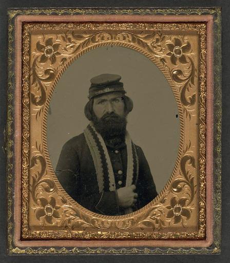 | Keywords: library of congress libraryofcongress dc:identifier=http://hdl.loc.gov/loc.pnp/ppmsca.27040 dc:identifier=httphdllocgovlocpnpppmsca27040 xmlns:dc=http://purl.org/dc/elements/1.1/ xmlns:dc=httppurlorgdcelements11 knitting scarf knitted soldier man beard mustache cap uniform oval frame picture frame photo border [Unidentified soldier in Union uniform with knitted stole] [between 1861 and 1865] 1 photograph : sixth-plate ambrotype, hand-colored ; 9.3 x 8.2 cm (case) Notes: Title devised by Library staff. Case: Leather geometric. Gift; Tom Liljenquist; 2010; (DLC/PP-2010:105). Subjects: Soldiers--Union--1860-1870. Military uniforms--Union--1860-1870. United States--History--Civil War, 1861-1865--Military personnel--Union. Format: Portrait photographs--1860-1870. Ambrotypes--Hand-colored--1860-1870. Rights Info: No known restrictions on publication. Repository: Library of Congress, Prints and Photographs Division, Washington, D.C. 20540 USA, hdl.loc.gov/loc.pnp/pp.print Part Of: Ambrotype/Tintype filing series (Library of Congress) (DLC) 2010650518 Liljenquist Family collection (Library of Congress) (DLC) 2010650519 More information about this collection is available at hdl.loc.gov/loc.pnp/pp.lilj Persistent URL: hdl.loc.gov/loc.pnp/ppmsca.27040 Call Number: AMB/TIN no. 2186 [Unidentified soldier in Union uniform with knitted stole] [between 1861 and 1865] 1 photograph : sixth-plate ambrotype, hand-colored ; 9.3 x 8.2 cm (case) Notes: Title devised by Library staff. Case: Leather geometric. Gift; Tom Liljenquist; 2010; (DLC/PP-2010:105). Subjects: Soldiers--Union--1860-1870. Military uniforms--Union--1860-1870. United States--History--Civil War, 1861-1865--Military personnel--Union. Format: Portrait photographs--1860-1870. Ambrotypes--Hand-colored--1860-1870. Rights Info: No known restrictions on publication. Repository: Library of Congress, Prints and Photographs Division, Washington, D.C. 20540 USA, hdl.loc.gov/loc.pnp/pp.print Part Of: Ambrotype/Tintype filing series (Library of Congress) (DLC) 2010650518 Liljenquist Family collection (Library of Congress) (DLC) 2010650519 More information about this collection is available at hdl.loc.gov/loc.pnp/pp.lilj Persistent URL: hdl.loc.gov/loc.pnp/ppmsca.27040 Call Number: AMB/TIN no. 2186 |