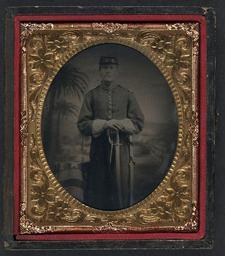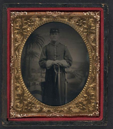 | Keywords: library of congress libraryofcongress dc:identifier=http://hdl.loc.gov/loc.pnp/ppmsca.27303 dc:identifier=httphdllocgovlocpnpppmsca27303 xmlns:dc=http://purl.org/dc/elements/1.1/ xmlns:dc=httppurlorgdcelements11 people photo border [Unidentified soldier in Union frock coat, forage cap, shoulder scales, and gauntlets with sword and scabbard in front of painted backdrop showing landscape with palm trees] [between 1861 and 1865] 1 photograph : sixth-plate tintype, hand-colored ; 9.5 x 8.2 cm (case) Notes: Title devised by Library staff. Case: Leather ornate floral motif. Gift; Tom Liljenquist; 2010; (DLC/PP-2010:105). Subjects: United States.--Army.--People.--1860-1870. Soldiers--Union--1860-1870. Military uniforms--Union--1860-1870. Daggers & swords--1860-1870. Backdrops--1860-1870. United States--History--Civil War, 1861-1865--Military personnel--Union. Format: Portrait photographs--1860-1870. Tintypes--Hand-colored--1860-1870. Rights Info: No known restrictions on publication. Repository: Library of Congress, Prints and Photographs Division, Washington, D.C. 20540 USA, hdl.loc.gov/loc.pnp/pp.print Part Of: Ambrotype/Tintype filing series (Library of Congress) (DLC) 2010650518 Liljenquist Family collection (Library of Congress) (DLC) 2010650519 More information about this collection is available at hdl.loc.gov/loc.pnp/pp.lilj Persistent URL: hdl.loc.gov/loc.pnp/ppmsca.27303 Call Number: AMB/TIN no. 2440 [Unidentified soldier in Union frock coat, forage cap, shoulder scales, and gauntlets with sword and scabbard in front of painted backdrop showing landscape with palm trees] [between 1861 and 1865] 1 photograph : sixth-plate tintype, hand-colored ; 9.5 x 8.2 cm (case) Notes: Title devised by Library staff. Case: Leather ornate floral motif. Gift; Tom Liljenquist; 2010; (DLC/PP-2010:105). Subjects: United States.--Army.--People.--1860-1870. Soldiers--Union--1860-1870. Military uniforms--Union--1860-1870. Daggers & swords--1860-1870. Backdrops--1860-1870. United States--History--Civil War, 1861-1865--Military personnel--Union. Format: Portrait photographs--1860-1870. Tintypes--Hand-colored--1860-1870. Rights Info: No known restrictions on publication. Repository: Library of Congress, Prints and Photographs Division, Washington, D.C. 20540 USA, hdl.loc.gov/loc.pnp/pp.print Part Of: Ambrotype/Tintype filing series (Library of Congress) (DLC) 2010650518 Liljenquist Family collection (Library of Congress) (DLC) 2010650519 More information about this collection is available at hdl.loc.gov/loc.pnp/pp.lilj Persistent URL: hdl.loc.gov/loc.pnp/ppmsca.27303 Call Number: AMB/TIN no. 2440 |