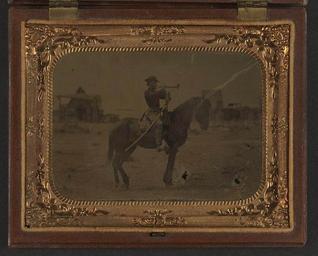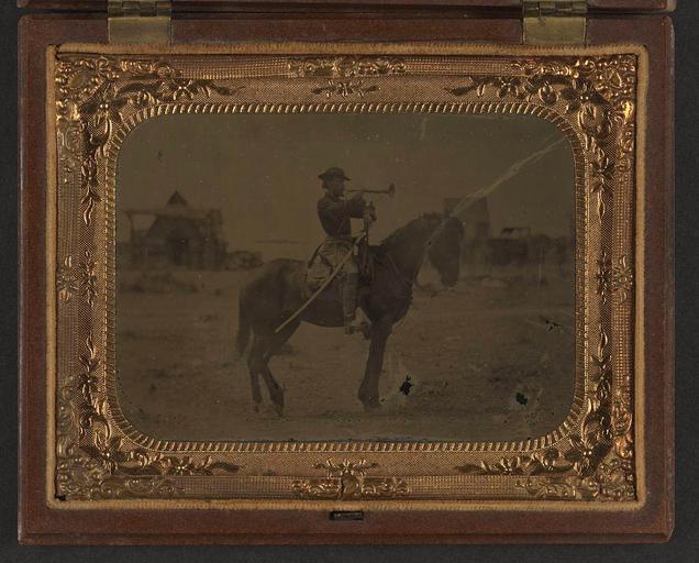 Keywords: library of congress libraryofcongress dc:identifier=http://hdl.loc.gov/loc.pnp/ppmsca.27528 dc:identifier=httphdllocgovlocpnpppmsca27528 xmlns:dc=http://purl.org/dc/elements/1.1/ xmlns:dc=httppurlorgdcelements11 picture frame photo border [Unidentified soldier in Union uniform atop horse blowing bugle while unsheathing sword] [between 1861 and 1865] 1 photograph : quarter-plate tintype, hand-colored ; 9.9 x 12.5 cm (case) Notes: Title devised by Library staff. Case: (front) Berg, no. 1-22; (back) Berg, no. 3-17. Gift; Tom Liljenquist; 2010; (DLC/PP-2010:105). Purchased from: The Horse Soldier, Gettysburg, Pennsylvania, 2002. Published in: Davis, William C. Rebels & yankees: The fighting men of the Civil War. London, England: Salamander Books Limited, 1999, p. 47. Subjects: United States.--Army--People--1860-1870. Soldiers--Union--1860-1870. Military uniforms--Union--1860-1870. Horses--1860-1870. Daggers & swords--1860-1870. Bugles--1860-1870. Musicians--1860-1870. United States--History--Civil War, 1861-1865--Military personnel--Union. Format: Portrait photographs--1860-1870. Tintypes--Hand-colored--1860-1870. Rights Info: No known restrictions on publication. Repository: Library of Congress, Prints and Photographs Division, Washington, D.C. 20540 USA, hdl.loc.gov/loc.pnp/pp.print Part Of: Ambrotype/Tintype filing series (Library of Congress) (DLC) 2010650518 Liljenquist Family collection (Library of Congress) (DLC) 2010650519 More information about this collection is available at hdl.loc.gov/loc.pnp/pp.lilj Persistent URL: hdl.loc.gov/loc.pnp/ppmsca.27528 Call Number: AMB/TIN no. 5019 [Unidentified soldier in Union uniform atop horse blowing bugle while unsheathing sword] [between 1861 and 1865] 1 photograph : quarter-plate tintype, hand-colored ; 9.9 x 12.5 cm (case) Notes: Title devised by Library staff. Case: (front) Berg, no. 1-22; (back) Berg, no. 3-17. Gift; Tom Liljenquist; 2010; (DLC/PP-2010:105). Purchased from: The Horse Soldier, Gettysburg, Pennsylvania, 2002. Published in: Davis, William C. Rebels & yankees: The fighting men of the Civil War. London, England: Salamander Books Limited, 1999, p. 47. Subjects: United States.--Army--People--1860-1870. Soldiers--Union--1860-1870. Military uniforms--Union--1860-1870. Horses--1860-1870. Daggers & swords--1860-1870. Bugles--1860-1870. Musicians--1860-1870. United States--History--Civil War, 1861-1865--Military personnel--Union. Format: Portrait photographs--1860-1870. Tintypes--Hand-colored--1860-1870. Rights Info: No known restrictions on publication. Repository: Library of Congress, Prints and Photographs Division, Washington, D.C. 20540 USA, hdl.loc.gov/loc.pnp/pp.print Part Of: Ambrotype/Tintype filing series (Library of Congress) (DLC) 2010650518 Liljenquist Family collection (Library of Congress) (DLC) 2010650519 More information about this collection is available at hdl.loc.gov/loc.pnp/pp.lilj Persistent URL: hdl.loc.gov/loc.pnp/ppmsca.27528 Call Number: AMB/TIN no. 5019 |