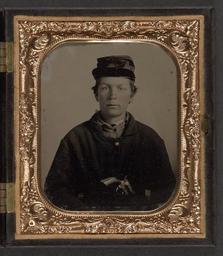 Keywords: library of congress libraryofcongress dc:identifier=http://hdl.loc.gov/loc.pnp/ppmsca.26901 dc:identifier=httphdllocgovlocpnpppmsca26901 xmlns:dc=http://purl.org/dc/elements/1.1/ xmlns:dc=httppurlorgdcelements11 u.s. civil war uscivilwar american civil war americancivilwar the civil war thecivilwar civil war civilwar war between the states warbetweenthestates united states of america unitedstatesofamerica u.s.a. usa the union theunion union the north thenorth yankee yankees soldier pistol revolver gun picture frame people photo border [Unidentified young soldier in Union uniform and forage cap with revolver] [between 1861 and 1865] 1 photograph : sixth-plate tintype, hand-colored ; 9.5 x 8.5 cm (case) Notes: Title devised by Library staff. Case: Berg, no. 3-110. Gift; Tom Liljenquist; 2010; (DLC/PP-2010:105). Subjects: United States.--Army--People--1860-1870. Soldiers--Union--1860-1870. Military uniforms--Union--1860-1870. Youth--1860-1870. Handguns--1860-1870. United States--History--Civil War, 1861-1865--Military personnel. Format: Portrait photographs--1860-1870. Tintypes--Hand-colored--1860-1870. Rights Info: No known restrictions on publication. Repository: Library of Congress, Prints and Photographs Division, Washington, D.C. 20540 USA, hdl.loc.gov/loc.pnp/pp.print Part Of: Ambrotype/Tintype filing series (Library of Congress) (DLC) 2010650518 Liljenquist Family collection (Library of Congress) (DLC) 2010650519 More information about this collection is available at hdl.loc.gov/loc.pnp/pp.lilj Persistent URL: hdl.loc.gov/loc.pnp/ppmsca.26901 Call Number: AMB/TIN no. 2048 [Unidentified young soldier in Union uniform and forage cap with revolver] [between 1861 and 1865] 1 photograph : sixth-plate tintype, hand-colored ; 9.5 x 8.5 cm (case) Notes: Title devised by Library staff. Case: Berg, no. 3-110. Gift; Tom Liljenquist; 2010; (DLC/PP-2010:105). Subjects: United States.--Army--People--1860-1870. Soldiers--Union--1860-1870. Military uniforms--Union--1860-1870. Youth--1860-1870. Handguns--1860-1870. United States--History--Civil War, 1861-1865--Military personnel. Format: Portrait photographs--1860-1870. Tintypes--Hand-colored--1860-1870. Rights Info: No known restrictions on publication. Repository: Library of Congress, Prints and Photographs Division, Washington, D.C. 20540 USA, hdl.loc.gov/loc.pnp/pp.print Part Of: Ambrotype/Tintype filing series (Library of Congress) (DLC) 2010650518 Liljenquist Family collection (Library of Congress) (DLC) 2010650519 More information about this collection is available at hdl.loc.gov/loc.pnp/pp.lilj Persistent URL: hdl.loc.gov/loc.pnp/ppmsca.26901 Call Number: AMB/TIN no. 2048 |