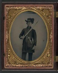 | Keywords: library of congress libraryofcongress dc:identifier=http://hdl.loc.gov/loc.pnp/ppmsca.27151 dc:identifier=httphdllocgovlocpnpppmsca27151 xmlns:dc=http://purl.org/dc/elements/1.1/ xmlns:dc=httppurlorgdcelements11 u.s. civil war uscivilwar american civil war americancivilwar the civil war thecivilwar civil war civilwar war between the states warbetweenthestates confederate states of america confederatestatesofamerica c.s.a. csa the confederacy theconfederacy confederacy confederate the south thesouth rebel rebels soldier gun pistol revolver sword sabre saber people photo border round picture frame [Unidentified young soldier in Confederate uniform and Hardee hat with holstered revolver and artillery saber] [between 1861 and 1865] 1 photograph : quarter-plate tintype, hand-colored ; 12.4 x 10.0 cm (case) Notes: Title devised by Library staff. Case: Berg, no. 1-41. Gift; Tom Liljenquist; 2010; (DLC/PP-2010:105). Purchased from: Normal Civil War Antiques, Normal, Illinois, 2002. Published in: Turner, William A. Even more Confederate faces. Gaithersburg, Md.: Olde Soldier Books, Inc. 1983, p. 140. Subjects: Confederate States of America.--Army--People--1860-1870. Soldiers--Confederate--1860-1870. Military uniforms--Confederate--1860-1870. Handguns--1860-1870. Daggers & swords--1860-1870. Youth--1860-1870. United States--History--Civil War, 1861-1865--Military personnel--Confederate. Format: Portrait photographs--1860-1870. Tintypes--Hand-colored--1860-1870. Rights Info: No known restrictions on publication. Repository: Library of Congress, Prints and Photographs Division, Washington, D.C. 20540 USA, hdl.loc.gov/loc.pnp/pp.print Part Of: Ambrotype/Tintype filing series (Library of Congress) (DLC) 2010650518 Liljenquist Family collection (Library of Congress) (DLC) 2010650519 More information about this collection is available at hdl.loc.gov/loc.pnp/pp.lilj Persistent URL: hdl.loc.gov/loc.pnp/ppmsca.27151 Call Number: AMB/TIN no. 2298 [Unidentified young soldier in Confederate uniform and Hardee hat with holstered revolver and artillery saber] [between 1861 and 1865] 1 photograph : quarter-plate tintype, hand-colored ; 12.4 x 10.0 cm (case) Notes: Title devised by Library staff. Case: Berg, no. 1-41. Gift; Tom Liljenquist; 2010; (DLC/PP-2010:105). Purchased from: Normal Civil War Antiques, Normal, Illinois, 2002. Published in: Turner, William A. Even more Confederate faces. Gaithersburg, Md.: Olde Soldier Books, Inc. 1983, p. 140. Subjects: Confederate States of America.--Army--People--1860-1870. Soldiers--Confederate--1860-1870. Military uniforms--Confederate--1860-1870. Handguns--1860-1870. Daggers & swords--1860-1870. Youth--1860-1870. United States--History--Civil War, 1861-1865--Military personnel--Confederate. Format: Portrait photographs--1860-1870. Tintypes--Hand-colored--1860-1870. Rights Info: No known restrictions on publication. Repository: Library of Congress, Prints and Photographs Division, Washington, D.C. 20540 USA, hdl.loc.gov/loc.pnp/pp.print Part Of: Ambrotype/Tintype filing series (Library of Congress) (DLC) 2010650518 Liljenquist Family collection (Library of Congress) (DLC) 2010650519 More information about this collection is available at hdl.loc.gov/loc.pnp/pp.lilj Persistent URL: hdl.loc.gov/loc.pnp/ppmsca.27151 Call Number: AMB/TIN no. 2298 |