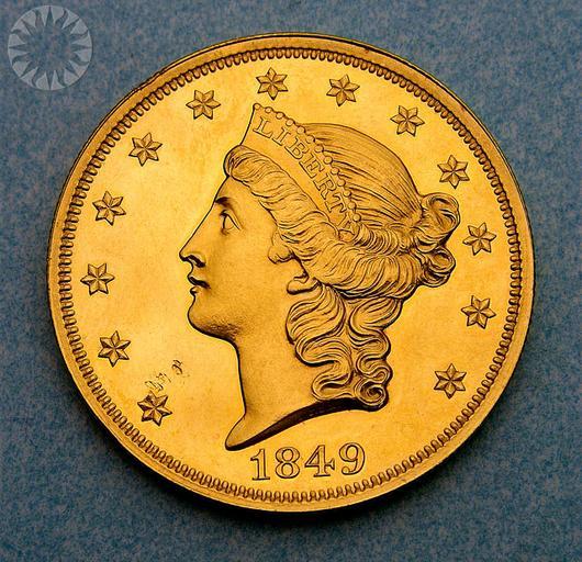 | Keywords: legendary coins legendarycoins numismatics money smithsonian probably public domain probablypublicdomain round circle indoor plate  SI Neg. 2005-27334. Date: 9/1/2005...The California gold rush quickly gave the United States not one new gold coin, but two: a tiny gold dollar at the lower end of the monetary spectrum, and a large double eagle, or twenty-dollar coin, at the upper end. Why did Americans need more gold denominations? .So much gold was now coming out of California that it was actually lowering the value of that metal against silver. Bullion dealers began buying up silver dollars and half dollars for melting and export, for they were now worth more than face value as bullion. A Congressman from North Carolina had an idea: If gold dollars were struck, to pass at par with the silver ones, it might ease some of the pressure on silver coinage. .His bill was introduced late in January 1849. At the last minute, a provision was added for an entirely new coin, a double eagle. Thus amended, the bill became law on March 3, 1849. The production of gold dollars swung into action fairly quickly, and coinage had gotten under way by early May. .But the double eagles took longer. James B. Longacre, the artist selected to design the new large coin, encountered initial opposition from Mint Officials, and it was late December before the first two pattern double eagles could be struck. One disappeared long ago, leaving this as the only surviving gold pattern from 1849..Click here to view the obverse...Credit: Tom Mulvaney (Smithsonian Institution)   SI Neg. 2005-27334. Date: 9/1/2005...The California gold rush quickly gave the United States not one new gold coin, but two: a tiny gold dollar at the lower end of the monetary spectrum, and a large double eagle, or twenty-dollar coin, at the upper end. Why did Americans need more gold denominations? .So much gold was now coming out of California that it was actually lowering the value of that metal against silver. Bullion dealers began buying up silver dollars and half dollars for melting and export, for they were now worth more than face value as bullion. A Congressman from North Carolina had an idea: If gold dollars were struck, to pass at par with the silver ones, it might ease some of the pressure on silver coinage. .His bill was introduced late in January 1849. At the last minute, a provision was added for an entirely new coin, a double eagle. Thus amended, the bill became law on March 3, 1849. The production of gold dollars swung into action fairly quickly, and coinage had gotten under way by early May. .But the double eagles took longer. James B. Longacre, the artist selected to design the new large coin, encountered initial opposition from Mint Officials, and it was late December before the first two pattern double eagles could be struck. One disappeared long ago, leaving this as the only surviving gold pattern from 1849..Click here to view the obverse...Credit: Tom Mulvaney (Smithsonian Institution) |