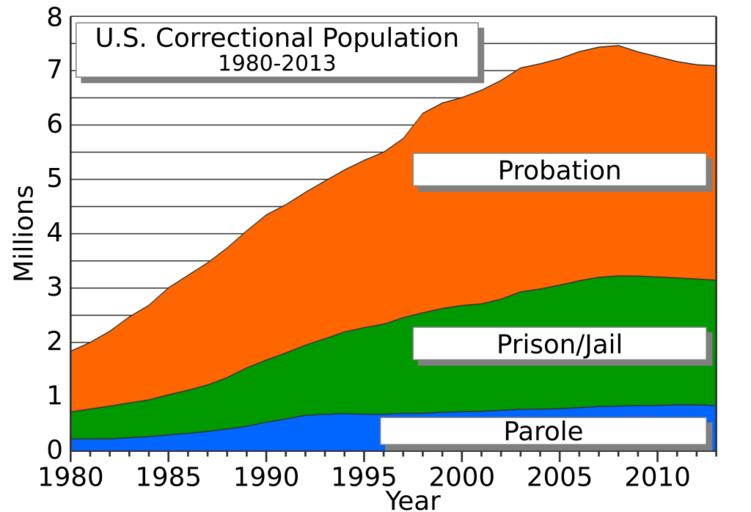 Keywords: United States correctional population.svg incarcerated in jail or prison in 2008 About 3 2 of the U S adult population or 1 in every 31 adults 2014-11-01 The statistics for the chart are from the Bureau of Justice Statistics BJS U S Department of Justice http //www bjs gov/index cfm ty pbdetail iid 4843 Correctional Populations in the United States 2012 NCJ 243936 See Tables 1 and 2 in the http //www bjs gov/content/pub/pdf/cpus12 pdf PDF for 2010-2012 numbers Table 1 also has rates per 100 000 for 2000 to 2012 http //www bjs gov/index cfm iid 2237 ty pbdetail Correctional Populations in the United States 2010 NCJ 236319 See Table 1 in the http //www bjs gov/content/pub/pdf/cpus10 pdf PDF for the table timeline showing the 2007 peak number under correctional supervision Table 1 has 2000 numbers and 2005 to 2010 numbers Correctional Population Trends Chart See https //web archive org/web/20121103121838/http //bjs ojp usdoj gov/content/glance/tables/corr2tab cfm archive with 1980 to 2009 numbers Some of those numbers may vary slightly from BJS numbers in later BJS publications http //www bjs gov/index cfm ty pbdetail iid 1106 Probation and Parole in the United States 2006 NCJ 220218 See http //bjs ojp usdoj gov/content/pub/pdf/ppus06 pdf PDF About 3 2 of the U S adult population or 1 in every 31 adults were incarcerated or on probation or parole at yearend 2006 Adults on probation in jail or prison and on parole United States 1980-2006 http //www albany edu/sourcebook/pdf/t612006 pdf PDF file http //www albany edu/sourcebook/csv/t612006 csv csv file format From http //www albany edu/sourcebook Sourcebook of Criminal Justice Statistics using BJS info See also http //www bjs gov/index cfm ty tp tid 11 Total Correctional Population Delphi234 other versions Data wikitable sortable Year Parole Prison/Jail Probation Total - 1980 222 036 498 252 1 118 097 1 838 385 - 1981 226 174 548 758 1 225 934 2 000 866 - 1982 224 604 603 369 1 378 668 2 206 641 - 1983 246 440 641 161 1 582 947 2 470 548 - 1984 266 992 676 416 1 740 948 2 684 356 - 1985 300 203 735 554 1 968 712 3 004 469 - 1986 326 259 794 820 2 114 821 3 235 900 - 1987 362 748 854 904 2 247 158 3 464 810 - 1988 407 596 945 625 2 386 427 3 739 648 - 1989 456 803 1 074 210 2 522 125 4 053 138 - 1990 531 407 1 145 300 2 670 234 4 346 941 - 1991 590 442 1 216 091 2 728 472 4 535 005 - 1992 658 601 1 290 861 2 811 611 4 761 073 - 1993 676 100 1 391 878 2 903 061 4 971 039 - 1994 690 371 1 503 165 2 981 022 5 174 558 - 1995 679 421 1 592 066 3 077 861 5 349 348 - 1996 679 733 1 656 214 3 164 996 5 500 943 - 1997 694 787 1 761 413 3 296 513 5 752 713 - 1998 696 385 1 848 936 3 670 441 6 215 762 - 1999 714 457 1 910 024 3 779 922 6 404 403 - 2000 723 898 1 955 323 3 826 209 6 505 430 - 2001 732 333 1 976 457 3 931 731 6 640 521 - 2002 750 934 2 045 991 4 024 067 6 820 992 - 2003 769 925 2 159 902 4 120 012 7 049 839 - 2004 771 852 2 211 090 4 143 792 7 126 734 - 2005 780 616 2 273 439 4 166 757 7 220 812 - 2006 799 875 2 334 684 4 215 361 7 349 920 - 2007 821 177 2 377 009 4 234 471 7 432 657 - 2008 829 560 2 393 838 4 238 590 7 461 988 - 2009 837 818 2 382 921 4 125 033 7 345 772 - 2010 840 598 2 362 531 4 053 115 7 256 244 - 2011 851 662 2 334 569 3 981 090 7 167 321 - 2012 851 158 2 314 921 3 942 776 7 108 855 - 2013 839 551 2 305 949 3 945 795 7 091 295 cc-zero Uploaded with UploadWizard Correctional population statistics for the United States |