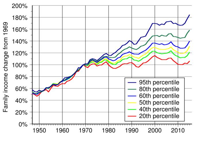 | Keywords: United States Family Income Change from 1969.svg  en From 1947 to 1969 the income of each income group increased from 73 for the top 5 to 94 for the bottom 20 but that year the minimum wage was cut from 1 60 an hour to 1 30 and since 1969 has declined by 14 adjusting for inflation Since 1968 the income of the bottom 20 has increased by only 6 while the top 5 has increased by 84 and the income of the top 1 has tripled Data from US Census Bureauhttps //www census gov/data/tables/time-series/demo/income-poverty/cps-finc/finc-01 html 2016-09-17 own Delphi234 other versions Generated with Wikimedia SVG Chart SVG Chart/box cc-zero Income distribution in the United States |