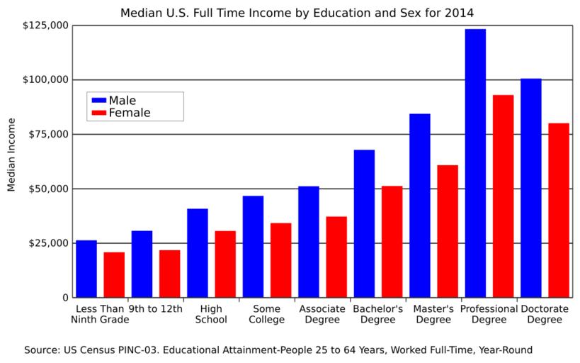 | Keywords: United States median income by education and sex full time 25-64.svg en This is a chart illustrating the inequality in wages between men and women when educational attainment is controlled Source US Census https //www census gov/data/tables/time-series/demo/income-poverty/cps-pinc/pinc-03 html PINC-03 2016-06-19 own Delphi234 other versions wikitable sortable - Education Gender gap - 1 Less than Ninth Grade 79 2 - 2 9th to 12th 71 0 - 3 High School 75 0 - 4 Some College 73 3 - 5 Associate Degree 72 8 - 6 Bachelor's Degree 75 6 - 7 Master's Degree 72 0 - 8 Professional Degree 75 5 - 9 Doctorate Degree 79 6 sortbottom colspan 2 Median Income 79 7 current annually cc-zero Income distribution in the United States Gender equality Educational attainment statistics for the United States SVG charts in English Sociological bar charts |