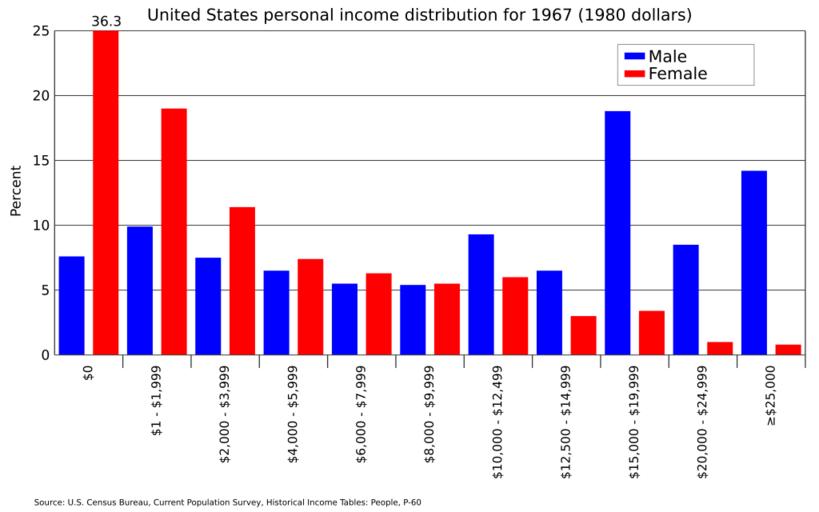 | Keywords: United States personal income by sex in 1980 dollars-1967.svg translate yes en Distribution of personal income by sex in the United States in 1967 in 1980 dollars Source U S Census Bureau Current Population Survey Historical Income People https //www2 census gov/prod2/popscan/p60-132 pdf P-60 Table 44 pgs 138-140 2016-05-05 own Delphi234 other versions Note wikitable - 1980 dollars 2014 dollars - 2 000 5 746 - 4 000 11 492 - 6 000 17 238 - 8 000 22 984 - 10 000 28 730 - 12 500 35 913 - 15 000 43 095 - 20 000 57 460 - 25 000 71 825 cc-zero Income distribution in the United States Personal income in the United States |