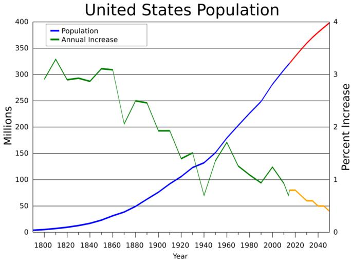 | Keywords: United States Population.svg translate yes en United States population and growth using census data from 1790 to 2010 with projected growth to 2050 Red and orange are projected growth http //www census gov/population/international/data/idb/region php N 20Results 20 T 13 A separate RT 0 Y 2014 2020 2025 2030 2040 2050 R -1 C US 2014-07-27 own Delphi234 Data wikitable - Year Population Annual Increase - 1770 2 148 100 - 1780 2 780 400 2 61 - 1790 3 929 214 3 52 - 1800 5 236 631 2 91 - 1810 7 239 881 3 29 - 1820 9 638 453 2 90 - 1830 12 866 020 2 93 - 1840 17 069 453 2 87 - 1850 23 191 876 3 11 - 1860 31 443 321 3 09 - 1870 38 558 371 2 06 - 1880 49 371 340 2 50 - 1890 62 979 766 2 46 - 1900 76 212 168 1 93 - 1910 92 228 531 1 93 - 1920 106 021 568 1 40 - 1930 123 202 660 1 51 - 1940 132 165 129 0 70 - 1950 151 325 798 1 36 - 1960 179 323 175 1 71 - 1970 203 211 926 1 26 - 1980 226 545 805 1 09 - 1990 248 709 873 0 94 - 2000 281 421 906 1 24 - 2010 308 745 531 0 93 - 2014 318 857 000 0 7 - 2015 321 369 000 0 8 - 2016 323 996 000 0 8 - 2017 326 626 000 0 8 - 2018 329 256 000 0 8 - 2019 331 884 000 0 8 - 2020 334 503 000 0 8 - 2025 347 335 000 0 7 - 2030 359 402 000 0 6 - 2035 370 338 000 0 6 - 2040 380 219 000 0 5 - 2045 389 394 000 0 5 - 2050 398 328 000 0 4 cc-zero Temporal population graphs of the United States Population growth |