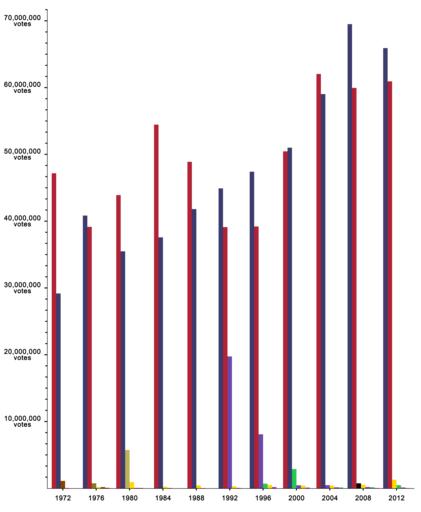 | Keywords: United States presidential election raw popular vote count bar graph (Expanded).png Key FFD900 Libertarian Party 1px AAAAAA solid 3C3B6E Democratic Party 1px AAAAAA solid B22234 Republican Party 1px AAAAAA solid FF0000 Communist Party USA 1px AAAAAA solid 884200 American Independent Party 1px AAAAAA solid 827C1D Eugene J McCarthy 1px AAAAAA solid BDB159 National Unity Party John B Anderson 1px AAAAAA solid 6B47AA Ross Perot/Reform Party of the United States of America 1px AAAAAA solid AB37C8 Constitution Party United States 1px AAAAAA solid 27C851 Greens/Green Party USA/Green Party of the United States 1px AAAAAA solid 000000 Ralph Nader other 1px AAAAAA solid F13A8D Ron Paul other 1px AAAAAA solid Notes <p>Although Ross Perot had not yet formed the Reform Party of the United States of America in 1992 his 1992 run is nevertheless displayed above as a Reform Party run <p>Although the Libertarian Party was on the ballot in all fifty United States plus D C in 2000 the Libertarian Party of Arizona due to a conflict with the national party opted to place L Neil Smith on the ballot in place of the national party's nominee Harry Browne The 5 775 votes received by Smith are included in the party's 2000 total <p>In 2008 the Libertarian Party of New Hampshire had two presidential candidates on the ballot Bob Barr and George Phillies The 531 votes received by Phillies are included in the party's 2008 total <p>The Green Party that nominated candidates for the presidency in 1996 and 2000 was the Greens/Green Party USA The Green Party that nominated candidates for the presidency ever since has been the Green Party of the United States <p>Although Ron Paul did not run in the general elections of 2008 or 2012 supporters nevertheless got his name on the ballot in some states and got him write-in access in others Ron Paul was also the Libertarian Party nominee in 1988 alexpeak com 22 March 2016 allixpeeke 200px Bar graph 175px Line graph 175px Expanded line graph Category American Independent Party presidential graphs Cc-zero United States presidential election statistics United States presidential election 1972 United States presidential election 1976 United States presidential election 1980 United States presidential election 1984 United States presidential election 1988 United States presidential election 1992 United States presidential election 1996 United States presidential election 2000 United States presidential election 2004 United States presidential election 2008 Libertarian Party presidential graphs United States Libertarian Party 1972 presidential campaign United States Libertarian Party 1976 presidential campaign United States Libertarian Party 1980 presidential campaign United States Libertarian Party 1984 presidential campaign United States Libertarian Party 1988 presidential campaign United States Libertarian Party 1992 presidential campaign United States Libertarian Party 1996 presidential campaign United States Libertarian Party 2000 presidential campaign United States Libertarian Party 2004 presidential campaign United States Libertarian Party 2008 presidential campaign United States Libertarian Party 2012 presidential campaign United States Democratic Party presidential graphs United States United States Democratic Party 1972 presidential campaign United States Democratic Party 1976 presidential campaign United States Democratic Party 1980 presidential campaign United States Democratic Party 1984 presidential campaign United States Democratic Party 1988 presidential campaign United States Democratic Party 1992 presidential campaign United States Democratic Party 1996 presidential campaign Al Gore presidential campaign 2000 United States Democratic Party 2004 presidential campaign United States Democratic Party 2008 presidential campaign United States Democratic Party 2012 presidential campaign Republican Party presidential graphs United States United States Republican Party 1972 presidential campaign United States Republican Party 1976 presidential campaign United States Republican Party 1980 presidential campaign United States Republican Party 1984 presidential campaign United States Republican Party 1988 presidential campaign United States Republican Party 1992 presidential campaign United States Republican Party 1996 presidential campaign George W Bush presidential campaign 2000 George W Bush presidential campaign 2004 United States Republican Party 2008 presidential campaign United States Republican Party 2012 presidential campaign Green Party of the United States presidential graphs Greens/Green Party USA 1996 presidential campaign Greens/Green Party USA 2000 presidential campaign Green Party of the United States 2004 presidential campaign Green Party of the United States 2008 presidential campaign Green Party of the United States 2012 presidential campaign Constitution Party presidential graphs United States U S Taxpayers Party 1992 presidential campaign U S Taxpayers Party 1996 presidential campaign Constitution Party 2000 presidential campaign United States Constitution Party 2004 presidential campaign United States Constitution Party 2008 presidential campaign United States Constitution Party 2012 presidential campaign United States Ron Paul graphs Ron Paul presidential campaign 2008 Ron Paul presidential campaign 2012 Ralph Nader graphs Ralph Nader presidential campaign 2000 Ralph Nader presidential campaign 2008 Reform Party of the United States of America presidential graphs Ross Perot presidential campaign 1992 Reform Party of the United States of America 1996 presidential campaign Reform Party of the United States of America 2000 presidential campaign Reform Party of the United States of America 2004 presidential campaign Communist Party USA presidential graphs National Unity Party presidential graphs United States Eugene McCarthy presidential graphs Charts in English Charts in French Political bar charts Electoral timelines of the United States of America Ga