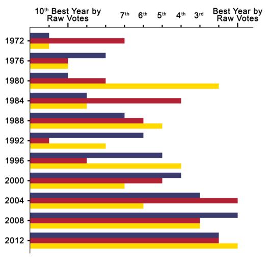 | Keywords: United States presidential ordinal interyear intraparty results comparison of raw popular votes bar graph.png Key FFD900 Libertarian Party 1px AAAAAA solid 3C3B6E Democratic Party 1px AAAAAA solid B22234 Republican Party 1px AAAAAA solid Note This graph ordinally charts in terms of raw popular votes the various prominent United States of America national parties' various presidential runs since 1972 in relation to one another as opposed to charting their various presidential runs in relation to the other United States of America national parties' various presidential runs For example using this graph one can see that the Libertarian Party had its highest raw popular vote count in 2012 and its fourth-highest raw popular vote count in 1996 or that the Democratic Party had its eighth-highest raw popular vote count since 1972 in 1976 or that the Republican Party had its eleventh-highest raw popular vote count since 1972 in 1992 alexpeak com 22 March 2016 allixpeeke 200px Expanded bar graph Cc-zero United States presidential election statistics United States presidential election 1972 United States presidential election 1976 United States presidential election 1980 United States presidential election 1984 United States presidential election 1988 United States presidential election 1992 United States presidential election 1996 United States presidential election 2000 United States presidential election 2004 United States presidential election 2008 Libertarian Party presidential graphs United States Libertarian Party 1972 presidential campaign United States Libertarian Party 1976 presidential campaign United States Libertarian Party 1980 presidential campaign United States Libertarian Party 1984 presidential campaign United States Libertarian Party 1988 presidential campaign United States Libertarian Party 1992 presidential campaign United States Libertarian Party 1996 presidential campaign United States Libertarian Party 2000 presidential campaign United States Libertarian Party 2004 presidential campaign United States Libertarian Party 2008 presidential campaign United States Libertarian Party 2012 presidential campaign United States Democratic Party presidential graphs United States United States Democratic Party 1972 presidential campaign United States Democratic Party 1976 presidential campaign United States Democratic Party 1980 presidential campaign United States Democratic Party 1984 presidential campaign United States Democratic Party 1988 presidential campaign United States Democratic Party 1992 presidential campaign United States Democratic Party 1996 presidential campaign Al Gore presidential campaign 2000 United States Democratic Party 2004 presidential campaign United States Democratic Party 2008 presidential campaign United States Democratic Party 2012 presidential campaign Republican Party presidential graphs United States United States Republican Party 1972 presidential campaign United States Republican Party 1976 presidential campaign United States Republican Party 1980 presidential campaign United States Republican Party 1984 presidential campaign United States Republican Party 1988 presidential campaign United States Republican Party 1992 presidential campaign United States Republican Party 1996 presidential campaign George W Bush presidential campaign 2000 George W Bush presidential campaign 2004 United States Republican Party 2008 presidential campaign United States Republican Party 2012 presidential campaign Political bar charts Charts in English Electoral timelines of the United States of America Gary Johnson graphs |