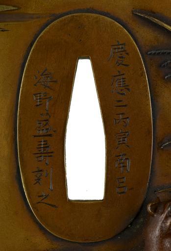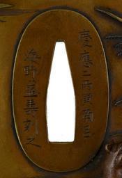 | Keywords: Unno Moritoshi - Tsuba Referring to the Noh Play "Kayoi Komachi" - Walters 51385 - Mark A.jpg At the lower right of the tsuba a dog sits among reeds with a skull and a skeleton A full moon breaks through clouds at the upper right This scene is a traditional reference to the noh play Kayoi Komachi The Nightly Courting of Komachi Ono no Komachi was a 9th-century poet In the play her spirit and the spirit of her suitor Fukakusa no Shôshô appear to a priest The priest deduces that one of the ghosts is Ono no Komachi because the ghost makes a reference to her poem about pampas grass growing through a skull On the back the straw hat at the lower left is an allusion to a legend about Ariwara no Narihira finding Komachi's skull while he was traveling 1866 Edo copper gold silver cm 8 4 accession number 51 385 14749 Henry Walters Baltimore date and mode of acquisition unknown Walters Art Museum Henry Walters Acquired by Henry Walters Date Keio ni hi-no-e tora nanro/Unno Moritoshi kore o kizamu; Signature Keio ni hi-no-e tora nanro/Unno Moritoshi kore o kizamu; Translation Eighth month in the second year of Keio 1866 the year of the Tiger/This was engraved by Unno Moritoshi place of origin Mito Japan Walters Art Museum license Tosogu Japanese sword fittings in the Walters Art Museum Unno Moritoshi Media contributed by the Walters Art Museum needs category review |