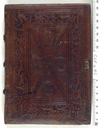| Keywords: Unser lieben Frawen Psalter vonn den dreien-rosenkrenntzen, wie man die ordnen unnd peten sol mitt vil bewerten exemplen eyn vast nutzlichs buechlin. - Lower cover (c65g18).jpg Style Panel design; Caption Lower cover; Colour Brown; Edge Unspecified exhibition history Decorative Technique Tooled in blind; Cover Material Goatskin includes morocco turkey etc 1 pair of clasps Macchi states; Hunting scene roll and Evangelist tool not found in I Schunke's Die Schwenke-Sammlung and E Kyriss's Verzierte gothische Einbände BL C 19 f 13 among Italian bindings also shows a hunting scene This scene was often tooled on German bindings especially southern ones often covering liturgical books An allegory was built up in Germany around Christian efforts to convert sinners This religious pursuit after the unrighteous is likened to the worldly sport of hunting hares kids wild boars and stags these animals are personified in this metaphorical conception by identifying the hares with the incontinent the kids with the proud the wild boars with the rich and the stags with the worldly-wise Continuing the allegory these personified sinners are struck with the arrows of good example in an endeavour to convert them from their evil ways and are chased by the dogs of preachers's voices in order to frighten them Typical of this century the upper cover gothic iscription E Diehl Bookbinding p 141 object history Text 1502; Augsburg; Unspecified object type Cc-zero place of creation Binding Germany place of discovery Unspecified British Library image http //www bl uk/catalogues/bookbindings/LargeImage aspx RecordId 020-000007400 ImageId ImageId 43305 Copyright BL Unser lieben Frawen Psalter vonn den dreien rosenkrenntzen wie man die ordnen unnd peten sol mitt vil bewerten exemplen eyn vast nutzlichs buechlin Uploaded with GWToolset Unser lieben Frawen Psalter vonn den dreien rosenkrenntzen wie man die ordnen unnd peten sol mitt vil bewerten exemplen eyn vast nutzlichs buechlin - Lower cover c65g18 http //www webarchive org uk/bldatasets/bindings/7831_4 jpg Bookbinding 16th-century bookbinding British Library Bookbindings Alanus de Rupe |