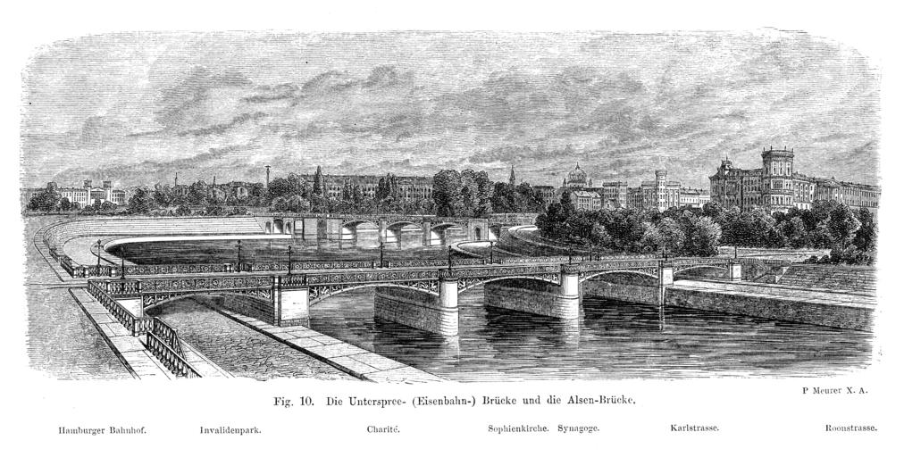 Keywords: Unterspree-und-Alsen-Bruecke.png en Bridge crossing the Spree river in Berlin built for the street-level inner-city connecting railway de Berlin Verbindungsbahn linking the main railway terminal stations in Berlin This wrought-iron bridge was built 1864/65 to replace the original wooden bridge built in 1851 which was actually located 70 meters upstream The railway traffic ended after the en Berlin Ringbahn replaced the Verbindungsbahn in 1871 The bridge pictured here proved to be unstable and was demolished in 1884 and demolished in 1887 Its place took the en Moltke Bridge built from 1886 until 1891 and which still stands today Schiedeeiserne Unterspree-Brücke über die Spree; gebaut 1864/65 als Ersatz für die 1851 als Teil der alten Berliner Verbindungsbahn gebaute hölzerne Brücke Die hier abgebildete Brücke wurde durch die 1886-1891 gebaute und heute noch stehende de Moltkebrücke ersetzt Berlin und seine Bauten Hrsg vom Architekten-Verein zu Berlin Berlin 1877 Selbstverlag Vertrieb im Buchhandel durch Verlag Ernst und Korn P Meurer X A Xylographische Anstalt 1877 pd-old-70-1923 Berliner Verbindungsbahn Alsenbrücke Moltkebrücke