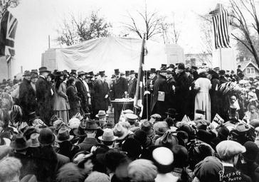 Keywords: Unveiling of the Bell Telephone Memorial, October 24, 1917, in Brantford, Ontario Canada.jpg en From the Brantford Public Library's website <br/> Member of Parliament W F Cockshutt first broached the idea of building a memorial in honour of Alexander Graham Bell the inventor of the telephone The Bell Telephone Memorial Association was incorporated in 1906 Over 65 000 was raised through donations from the federal and provincial governments and from citizens in Brant County and elsewhere <br/> In 1908 sculptors were asked to submit plans for the memorial to the designs committee Walter S Allward of Toronto won the competition The memorial was originally supposed to be completed by 1912 but was actually not finished until five years later The site chosen for the monument was in Bell Memorial Gardens a small park bounded by Wellington King and West Streets <br/> The memorial was designed by Allward to symbolize the telephone's annihilation of space A series of steps go up to the main section where the figure Inspiration appears over a reclining male figure while the floating figures of Knowledge Joy and Sorrow are positioned at the other side At each end of the memorial there are two female figures representing humanity To commemorate the invention of the telephone by Alexander Graham Bell in 1874 is inscribed on the monument <br/> The Duke of Devonshire the Governor General of Canada unveiled this memorial on October 24 1917 Brantford Expositor October 24 1917 p 1 <br/><br/> Alexander Graham Bell made a speech and presented the Governor General with a commemorative silver telephone seen on the table centre http //brantford library on ca/archive/index php/archive/download/HistoricSitesandMonuments pdf Pg 2 Creator Park Co 1917-10-24 unknown PD-Canada PD-old Unveiling of the Bell Telephone Memorial Bell System Park Co |