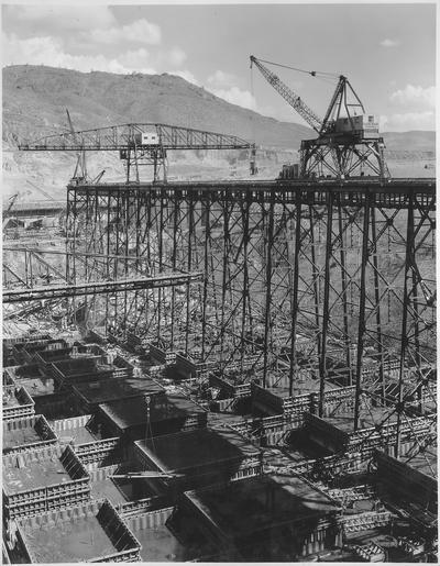 Keywords: "Upstream placing trestle on the west side showing cranes handling concrete blocks below." - NARA - 294306.tif Scope and content Photograph from Volume Two of a series of photo albums documenting the construction of the Grand Coulee Dam and related work on the Columbia Basin Project General notes 294306 Local identifier Department of the Interior Bureau of Reclamation Engineering and Research Center 05/18/1981 - 03/04/1988 NARA's Rocky Mountain Region Denver NRGA Building 48 Denver Federal Center West 6th Avenue and Kipling Street Denver CO 80225-0307 1936-03-25 Record group Record Group 115 Records of the Bureau of Reclamation 1889 - 2008 Record group ARC 444 Photograph albums compiled 1903 - 1972 Series ARC 293611 File unit File unit ARC Variant control numbers NAIL Control Number NRG-115-CONSTPHO85006-COLBASIN21034 yes Other versions <gallery> File Upstream_placing_trestle_on_the_west_side_showing_cranes_handling_concrete_blocks_below _-_NARA_-_294306 tif tif File Upstream_placing_trestle_on_the_west_side_showing_cranes_handling_concrete_blocks_below _-_NARA_-_294306 jpg jpg </gallery> NARA-cooperation PD-USGov Construction of the Grand Coulee Dam NARA TIF images with categorized JPGs |