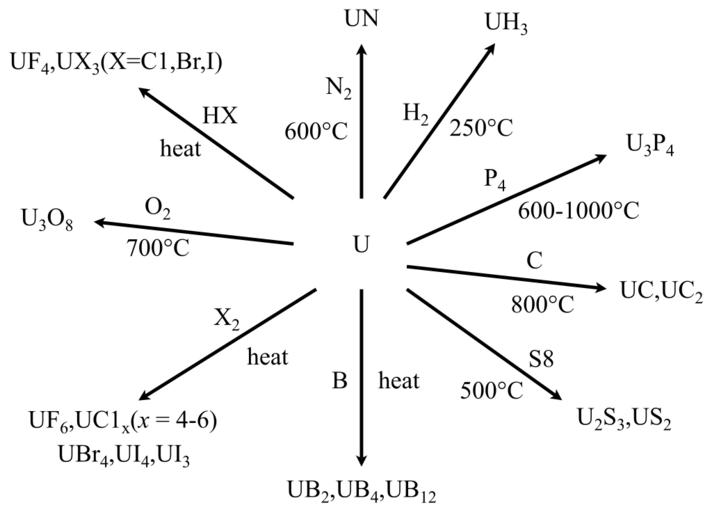 MAKE A MEME View Large Image Uranium reactions.svg en Reactions of uranium metal From Cotton Simon 2006 Lanthanide and Actinide Chemistry John Wiley Sons Ltd page 156 2016-08-02 Created SVG from scratch using the work done by Double sharp on W en File Uranium reactions ...