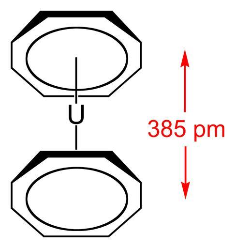 Keywords: Uranocene-385pm.png Skeletal formula of the uranocene molecule C<sub>8</sub>H<sub>8</sub> <sub>2</sub>U with the distance 385 pm between the planes of the two rings indicated own Benjah-bmm27 Benjah-bmm27 Uranocene