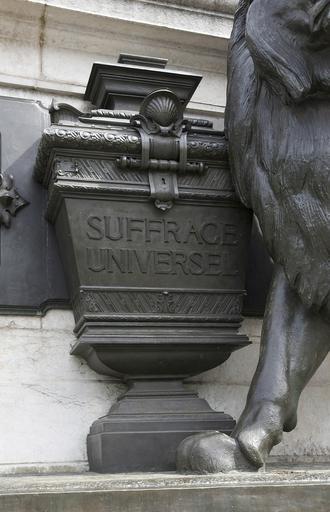 Keywords: Urne Ballot box république.jpg en Universal suffrage bronze ballot boxe on the pedestal of the Monument to the Republic Place de la République Paris fr Suffrage Universel urne de vote en bronze sur le socle du Monument à la République Place de la République Paris own Jebulon 1883 02 avril 2011 for photograph 48 52 2 7 N 2 21 49 3 E Statue of lion Monument à la République Quality images by Jebulon Quality images of architectural elements in Paris Ballot boxes Cc-zero QualityImage