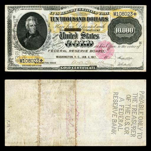 Keywords: US-$10000-GC-1900-Fr.1225.jpg 10 000 Gold Certificate depicting Andrew Jackson During a fire at the Treasury Building in 1922 a box of redeemed notes was thrown out the window This is the only issue of US paper currency 1861- to the present not worth its face-value 2012-08 Image by Godot13 The Bureau of Engraving and Printing Institution Smithsonian National Museum of American History Use of this image should give credit to the National Numismatic Collection at the Smithsonian Institution 2013030510011547 <noinclude> DEFAULTSORT US- 10-GC-1907-Fr 1167 jpg </noinclude> PD-USGov self cc-by-sa-4 0 Godot13 National Numismatic Collection <br>National Museum of American History Currency Uploaded with UploadWizard NNC Banknotes scanned by User Godot13 NNC United States Banknotes 1861-present 10000 United States dollar banknotes Andrew Jackson on money 2013 User Godot13 |
