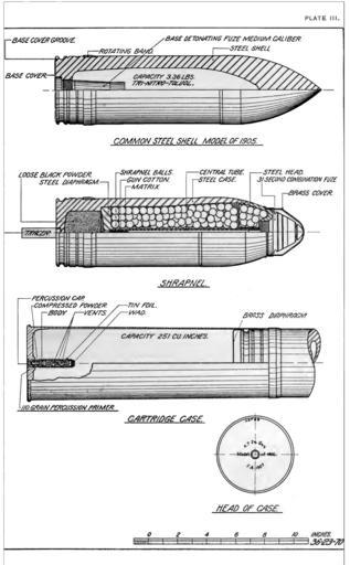 | Keywords: US 4.7 inch field gun ammunition diagrams.jpg Diagrams depicting ammunition for US 4 7 inch field gun M1906 Plate III in Handbook of the 4 7 inch Gun Matériel Model 1906 Ordnance Dept U S Revised September 1917 <br> Downloaded from http //archive org/details/handbookof47inch00unitrich 1910 Ordnance Dept U S PD-USGov 4 7 inch Gun Model 1906 Artillery ammunition before World War I Shrapnel shell Cartridge cases | ||||