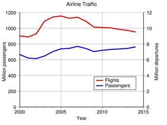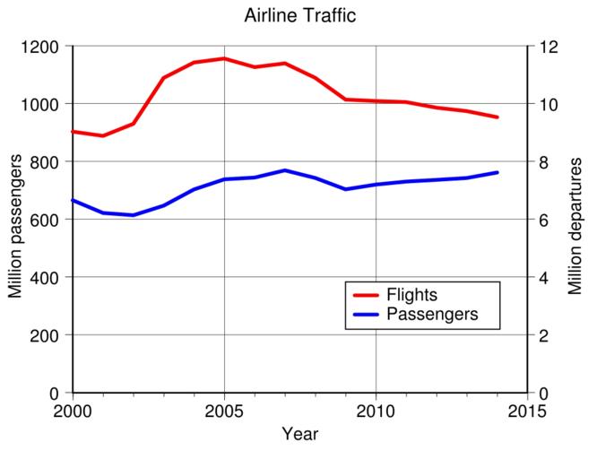 Keywords: US Airline Traffic Trends.svg 9/11 and the recession of 2008 More people died on the highways because they were afraid of flying than died on 9/11/01 2016-08-24 own Delphi234 other versions current annually Generated with Wikimedia SVG Chart SVG Chart/box cc-zero Aviation statistics |