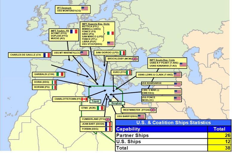 | Keywords: US and Coalition Maritime Forces Libya 2011.jpg Operation Odyssey Dawn in Libya 2011 U S and Coalition Maritime Forces Laydown US Vice Admiral Bill Gortney Director of The Joint Staff You can see here a quick view of the maritime laydown with most ships operating just to the north of Libya These are of course notional positions as the ships are moving about but it gives you a sense of the size and scope of the naval effort being expended by the -- by the coalition Twenty-six of these ships are being contributed by partner nations today up from 22 on Sunday and the United States has a total of 12 I ™d note that the presence of two aircraft carriers France ™s Charles De Gaulle and Italy ™s Garibaldi both of which have combat aircraft that embark http //www defense gov/transcripts/transcript aspx transcriptid 4798 http //www defense gov/news/d20110324pptslides pdf 2011-03-24 U S Department of Defense Office of the Assistant Secretary of Defense Public Affairs PD-USGov Operation Odyssey Dawn 2011 military intervention in Libya Maps of the 2011 Libyan civil war |