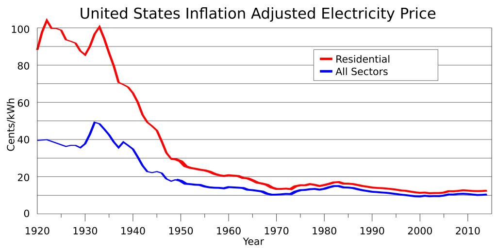 | Keywords: US inflation adjusted electricity prices.svg translate yes en United States inflation adjusted electricity prices from 1920 to 2014 comparing residential with all sectors Data is from EIA Electric Power Monthly Table 5 3 http //www eia gov/electricity/monthly/ US Census data http //www census gov/history/pdf/histstats-colonial-1970 pdf Page 827 and http //www census gov/compendia/statab/2012/tables/12s0947 xls CPI from http //www bls gov/data/ 2014-09-18 own Delphi234 File US electricity prices svg current annually cc-zero Uploaded with UploadWizard Electricity prices in the United States |