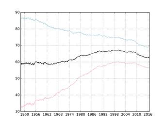 | Keywords: US Labor Participation Rate by gender.svg validSVG en Graph of US Civilian Labor Participation Rate from 1948 to 2011 by gender Men are represented in light blue women in pink and the total in black Bureau of Labor Statistics within the United States Department of Labor User Int21h 2011-10-08 cc-zero thumbthumb Source code <source lang python > /usr/bin/env python Create an SVG graph of BLS timeseries data using matplotlib and BeautifulSoup import matplotlib figure import datetime import bs4 import matplotlib backends backend_cairo import string import urllib2 def main url 'http //data bls gov/timeseries/ s years_option specific_years include_graphs true to_year 2011 from_year 1948' total_series 'LNS11300000' men_series 'LNS11300001' women_series 'LNS11300002' fig ax init_figure add_plot ax scrape_bls bs4 BeautifulSoup urllib2 urlopen url total_series 'black' add_plot ax scrape_bls bs4 BeautifulSoup urllib2 urlopen url men_series 'lightblue' add_plot ax scrape_bls bs4 BeautifulSoup urllib2 urlopen url women_series 'pink' save_figure fig 'US Labor Participation Rate 1948-2011 by gender svg' Scrape the BLS soup for the data def scrape_bls soup table soup find_all 'table' attrs 'class' 'regular-data' assert len table 1 table table0 data years_lc t for t in r if type t is bs4 element Tag for r in table contents4 if type r is bs4 element Tag for row in years_lc year int row0 text months float t text for t in row1 if any c in string printable and c ' ' for c in t text data append year months return data Add plot to figure Extra parameters are passed to matplotlib axes Axes plot def add_plot axis data args x y for year months in data for month n in enumerate months x append datetime date year month+1 1 y append n axis plot x y args Initialize figure def init_figure figure matplotlib figure Figure axis figure add_subplot 111 axis xaxis set_major_locator matplotlib dates YearLocator 6 axis xaxis set_major_formatter matplotlib dates DateFormatter ' Y' axis grid True return figure axis Save figure def save_figure figure filename figure canvas matplotlib backends backend_cairo FigureCanvasCairo figure figure savefig filename transparent True if __name__ __main__ main </source> Labour Economic information graphics Economy of the United States SVG charts in English Sociological trend graphs |