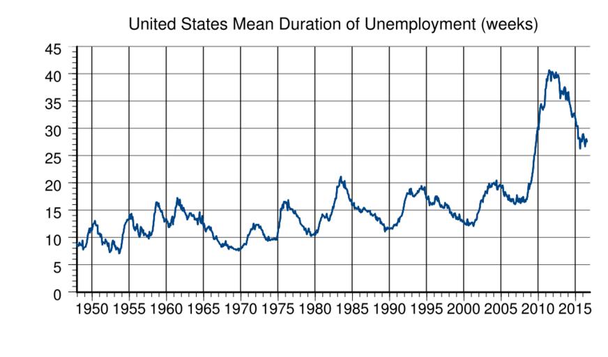 Keywords: US Mean Duration of Unemployment.svg en United States mean duration of unemployment 1948-2016 Data source FRED Federal Reserve Economic Data Federal Reserve Bank of St Louis http //research stlouisfed org/fred2/graph/ id UEMPMEAN Average Mean Duration of Unemployment UEMPMEAN ; U S Department of Labor Bureau of Labor Statistics; accessed March 30 2016 2014-10-07 own Delphi234 other versions File United States Mean Duration of Unemployment jpg current monthly Generated with Wikimedia SVG Chart SVG Chart/box cc-zero Unemployment in the United States Economic statistics |