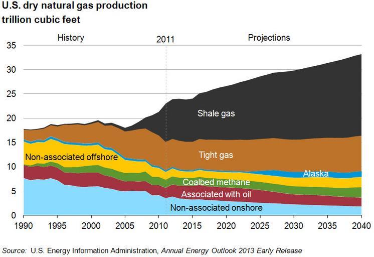 | Keywords: US Natural Gas Production 1990-2040.jpg en US natural gas production historical and projected by type of gas reservoir 2013-04-16 06 34 46 http //www eia gov/energy_in_brief/article/about_shale_gas cfm US Energy Information Administration PD-USGov Uploaded with UploadWizard Natural gas statistics Energy statistics of the United States graph |
